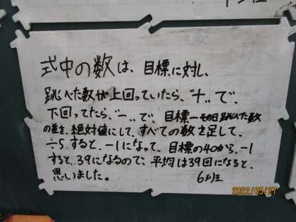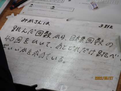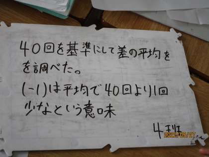 ホワイトボードの内容も的確にまとめられています。短くまとめたもの、より詳しく書いた班、どちらもすばらしい。数学というと、答えをどれだけ早く正確に出せるかというイメージがありますが、計算を解けるという技能も大事です。加えて、「数学的思考」これが生きていくうえで、どれほど大事なことか。社会に出ると、答えが一つでないことだらけです。頭をどれだけ鍛えておくか、そんなことを常日頃からよく考えているのですが、その意味でこの授業は「考える」「まとめる」「人に伝える」ということがシンプルな中にもしっかり含まれていました。すばらしい。