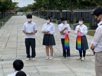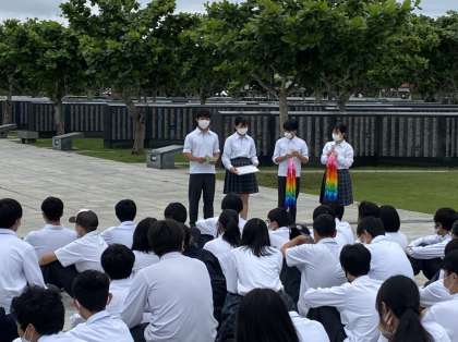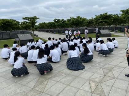 ひめゆり記念資料館でしっかり勉強しました。雨も心配で、すぐに摩文仁の丘の平和祈念公園で平和の誓いを捧げました。