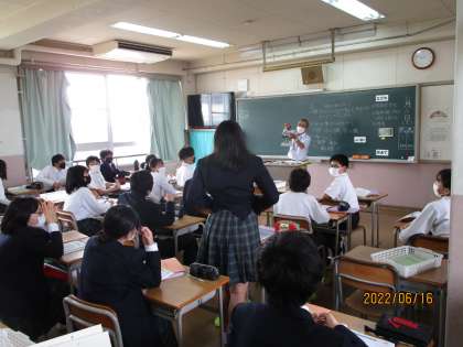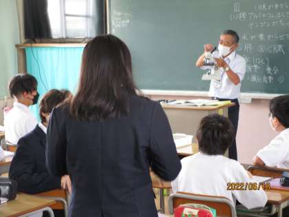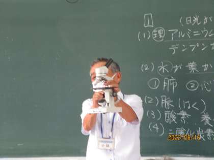 理科の先生が顕微鏡の部位名を一人ずつ聞いていました。指名された生徒は「対物レンズ」「接眼レンズ」などと答えていました。