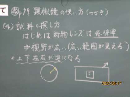 顕微鏡について説明を受けていました。倍率が高くなるほど、光の量が減ると先生が話していました。なるほど。