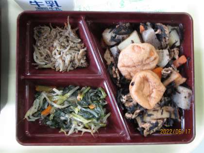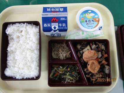 今日の献立はじゃこの炒いり煮、ほうれん草ともやしのカツオ和えといそ煮でした。すだちゼリーもつきました。