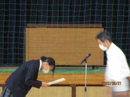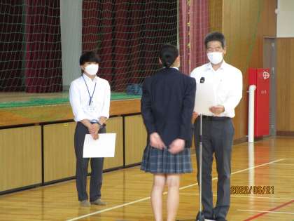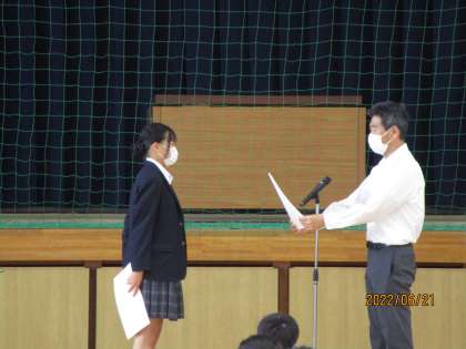 陸上部の人たちが北河内大会で個人優勝、フィールドの総合点で2位になりました。すばらしい。その表彰式を行いました。すばらしい。