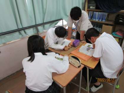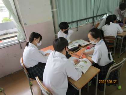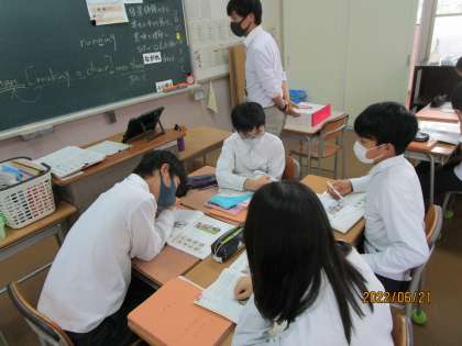 英語の文章中にある「後置修飾語」をさがし、用法や意味について説明できるようになるという授業です。この授業では常にアウトプット、すなわち、学習したことを言葉にして人に伝えるということを大事にしています。おのずから活動が多くなります。