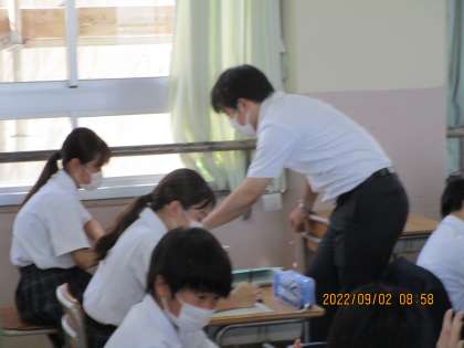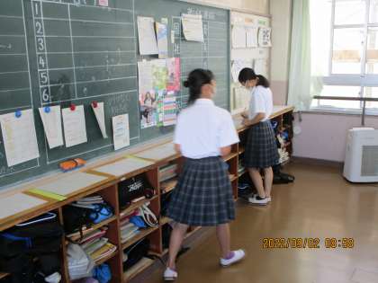 問題を解いています。解けた人から前と後ろの黒板に掲示されている解答を見て、自分で答え合わせをしていました。