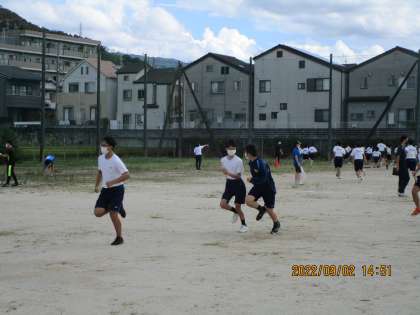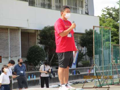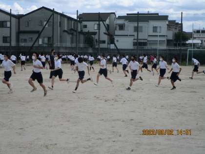 開会式の流れを確認しました。あいさつ、お辞儀の仕方、「休め」のタイミングなど、先生の指示がすぐに全員に伝わり、ほとんどやり直しのない練習でした。それが終わり、水分補給に5分の休憩を取って再開しました。そこで、生徒席へ移動です。