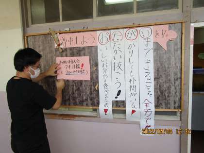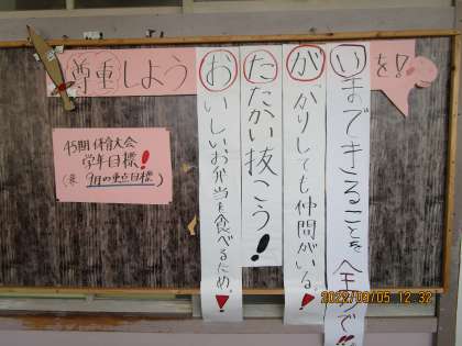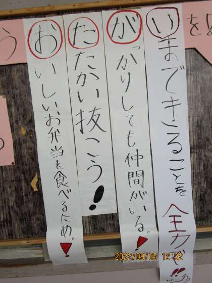 すばらしいです。1年学級委員会が議論して考えたそうです。「おいしい弁当を食べるために たたかいぬこう がっかりしても仲間がいる 今 できることを全力で」と書いていました。