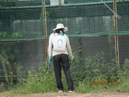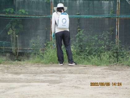 6限の蒸し暑い時間に校務員さんがグラウンドで除草剤散布をしていました。体育祭もあるので、手入れをしています。