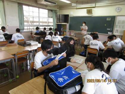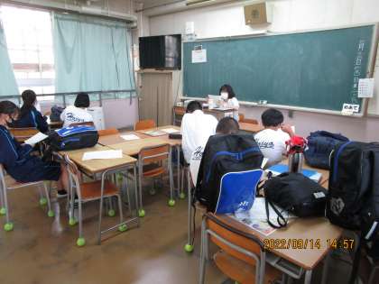 放課後に体育祭の係り打ち合わせを行いました。1枚めは、サッカー部とバドミントン部の用具・準備係りです。2枚めは、生活委員会の誘導係りの人たちです。3枚めは、図書委員による得点掲示・伝達係りの人たちです。