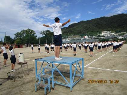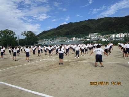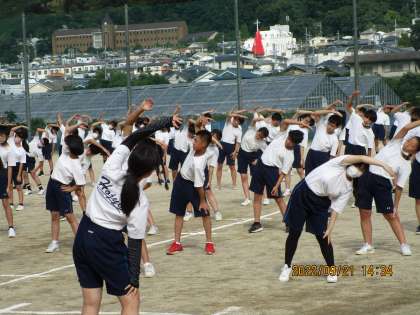 生徒会長のあいさつのあとに校歌を練習しました。2回目の練習で3年生が大きな声を出して先生に大いにほめてもらっていました。すばらしい。続いてラジオ体操の練習です。これもきれいにそろっていました。