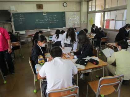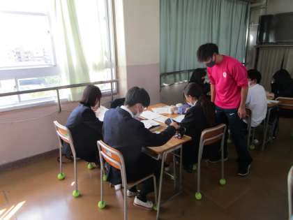 この授業はできるだけ先生の説明を聞く時間を短くして、生徒の活動の時間を長くしています。