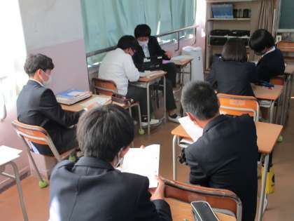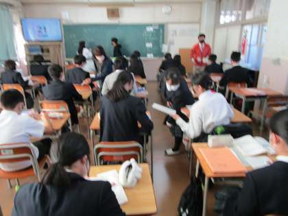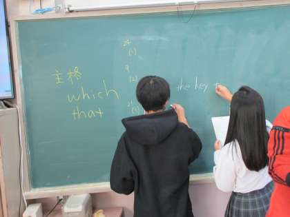 3年生の英語です。関係代名詞の目的格について説明ができるようになろうという授業です。黒板に解答を書いている生徒もいました。