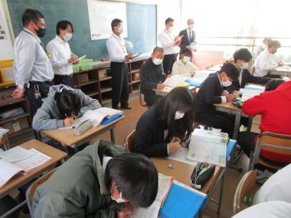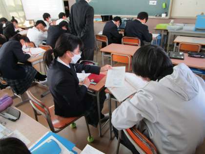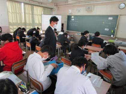 日本国健保では、なぜ、国民主権や平和主義が大切に言われてるのか、説明できるようになろうという授業です。実は大阪府教育庁の方が二人、北条中の授業を見に来られていたのですが、この授業も含め、先生の声がしっとりとしていて、どのクラスでも共通して取り組めていること(学習班の活用等)があり、すばらしいとお話しされていました。