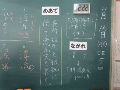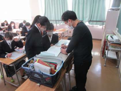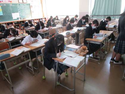根拠に基づいて自分の意見を書くという授業です。集中して書いている人が多かったです。できあがれば、先生に読んでもらって助言を受けます。