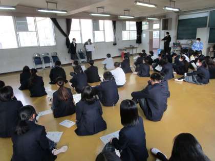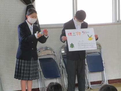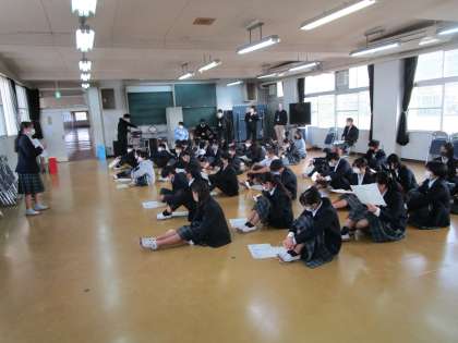 1年生の学年集会で学級委員会から新しい取り組みの発表がありました。すばらしい。