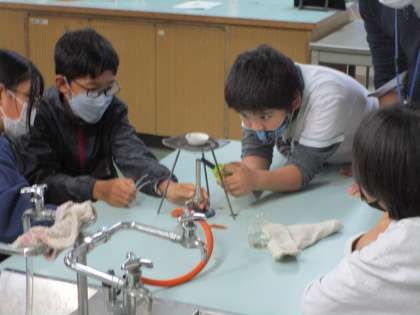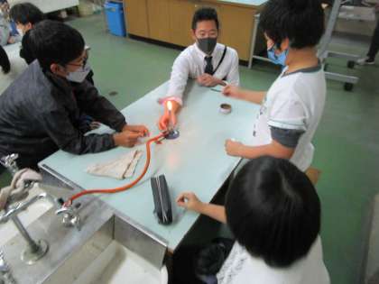 理科の授業でガスバーナーをつけることにチャレンジしました。続いて、10円玉を熱して変化を観察しました。