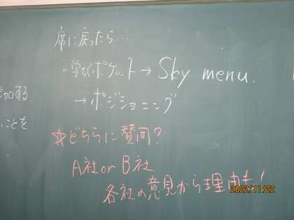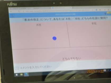 これはスカイメニュー、学びポケットというタブレット上のアプリを活用してポジショニングにチャレンジしているところです。ポジショニングとは、自分の意見が(たとえば)イエス、ノーのどちらか、あるいはどちらとも言えないけど、中間よりかはイエスに近いなどということを「位置」で知らせる機能です。