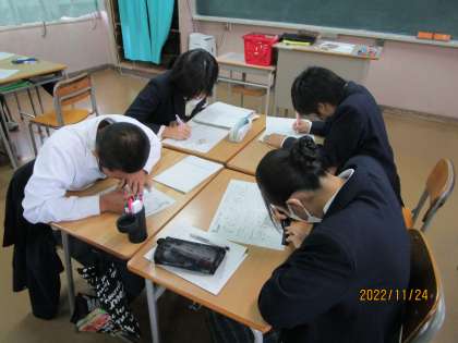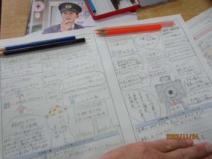 先日、職場体験の代わりに警察官、事務職、美容師、写真屋さん、ハローワークの方たちからお話を聞きました。そのまとめを一生懸命やっていました。3枚めの写真は、「校長先生、しっかり書いたから見てください。」とある生徒が見せてくれたものです。言うだけあってすばらしいものでした。