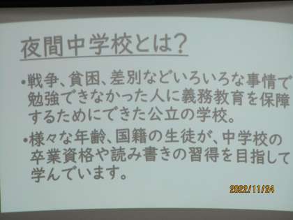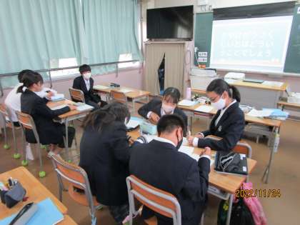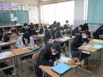1年生は12月2日守口市の夜間中学校を訪問します。さまざまな理由で若い頃に学習できなかった人たちや外国から来た人たちが学習するのが夜間中学校です。そのための事前学習をしていました。「文字が書けるようになると、それまでと何が変わりますか。」という先生の問いかけに一生懸命考えていました。