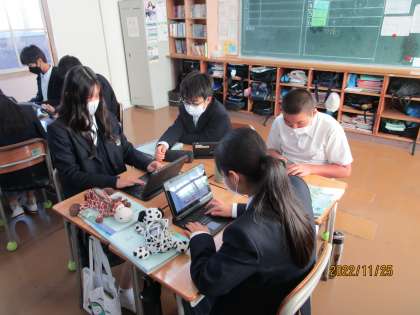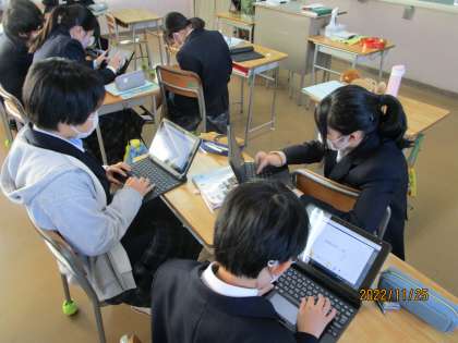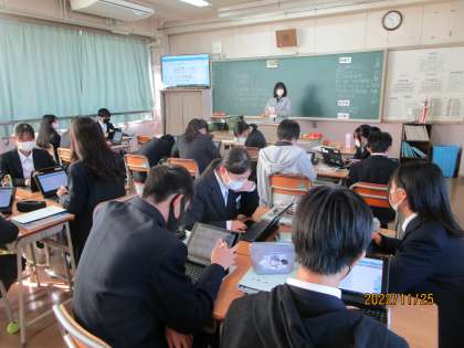 全員がタブレットを活用して、自分の好きな食べ物、嫌いな食べ物についてリストアップしていました。そして、互いに交流していました。納豆が嫌いな生徒、じゃがいもが大好物の生徒、ガレットがおいしかったと言う生徒、聞いているとお腹が減ってきました。