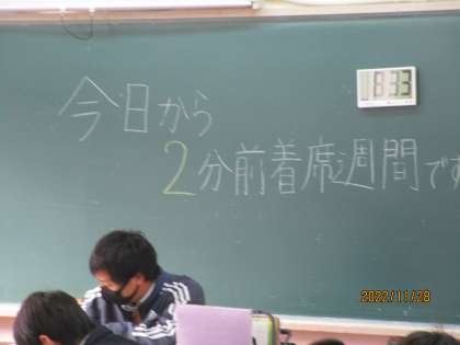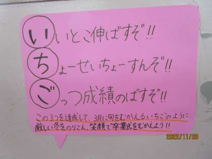 朝の巡回で発見しました。3年生の廊下に大きく掲示してありました。3年生の意欲を感じます。2番目は「超成長するぞ。」ですね。