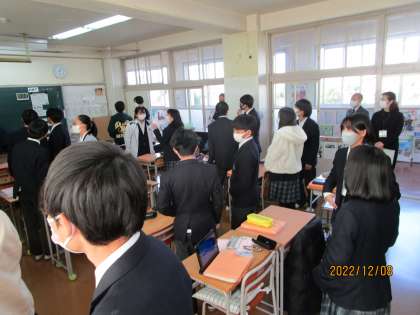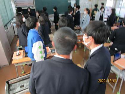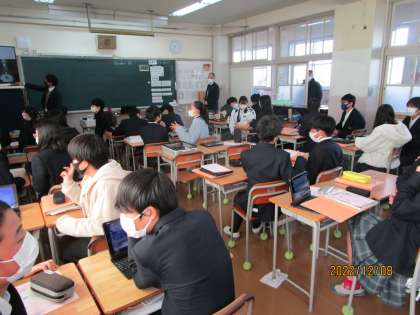12月8日、今日は大阪府のスマートスクール実現モデル校事業が北条中で行われました。昨年度に引き続き2年めです。大阪府下から約100名の先生方が来られました。写真は英語で会話練習をしているところです。後ろにお客さんがたくさんおられますが、普段の調子で楽しく会話していたので、ものすごくうれしかったです。