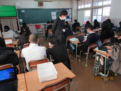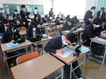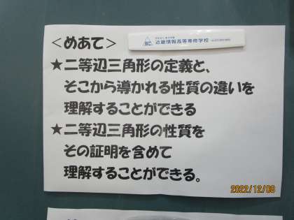 二等辺三角形の性質について勉強しています。タブレットに仁藤店三角形の証明問題が出題され、下記にある語群から用語を選んで答えていました。