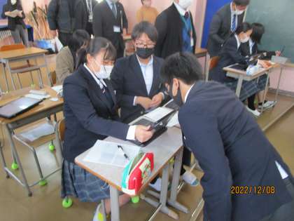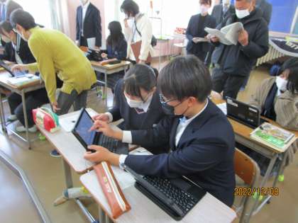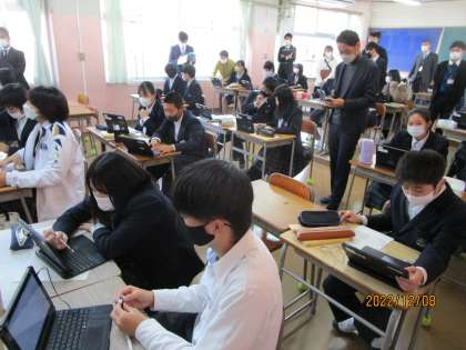 よく聞くのが「ICTを活用すると、生徒のつながりがなくなる。」という先生がいるとのことです。写真を見てください。「こんなんできたで。」「ここ、どうするの・」と子どもたちは安心してつながっています。北条中の生徒みんなにありがとうと言いたいです。