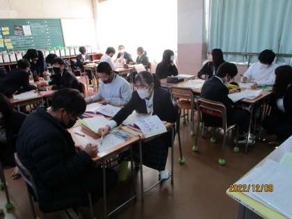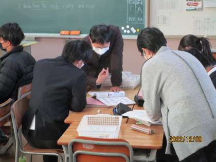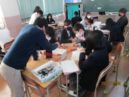 「where 〜 to〜」と「how to 〜」の使い方を学習する授業でした。プリントの確認問題を学習班で学び合いや先生に質問して解いていました。