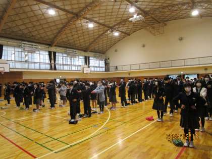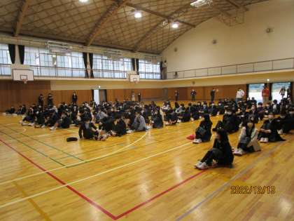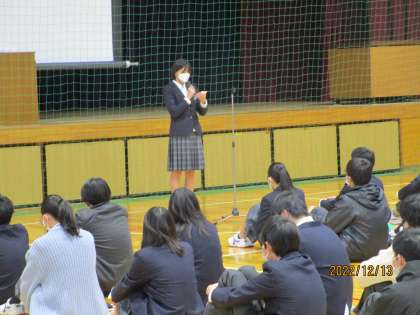 生徒集会が始まり、始めに生活委員会が冬に負けない体づくりについて話をしました。いろいろな細菌に対してしっかり消毒して感染予防しようと話もありました。ありがとう。今日の集会も時刻3分前に体育館に来ている人も多く、「ナイスやで。」と声をかけました。