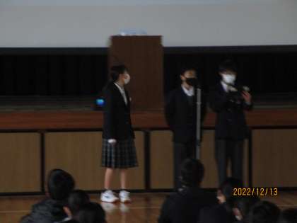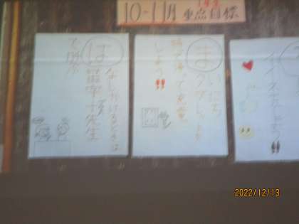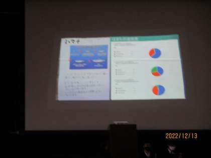 1年生の発表もすばらしかったです。1.月間目標と成果について2.夜間中学訪問について、発表しました。写真は月間目標のことを話しています。すごいのは、3枚めです。目標を決めて、どの項目が何パーセント達成できたかグラフにして表しています。すばらしいですね。