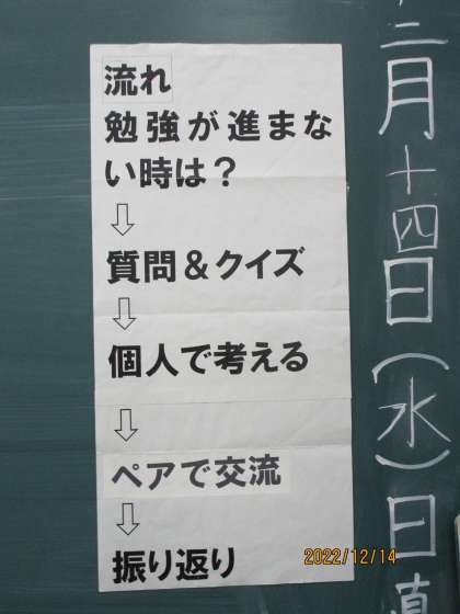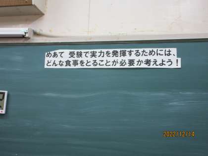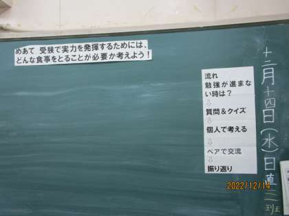 1限、栄養教諭が3年生のクラスで受検前に気をつけたいこととして食育の授業を行いました。めあてと流れがはっきりしていました。目当ては建築でいうと完成図、ながれは工程を示します。今日は何の勉強だったっけ、と思ったときに黒板に掲示されているとよく分かります。