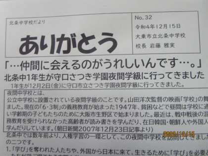 学校便りを発行しました。今回は12月2日(金)に1年生が守口さつき学園夜間学級を訪問したときのことを報告しています。ぜひ、ご覧になってください。生徒にも配付し、ホームページにもアップしています。