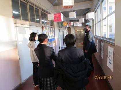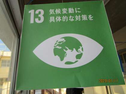 放課後の人権クラブの様子です。人権クラブでは持続可能な世界を実現するSDGsについて勉強し、啓発活動をすることになりました。今日は、大きなサイコロ状の箱にSDGsの目標や内容を書いた紙を貼ったものを廊下の天井につるしていました。