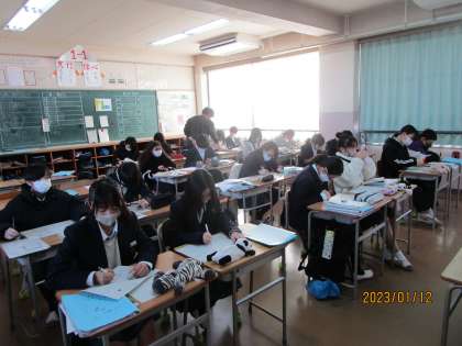 1年生は昨日、大阪府のチャレンジテストの国・数・英と受けました。府チャレとはちがいますが、社会と理科も実力テストを実施し、この時間はそのテストの返却と振り返りを行いました。