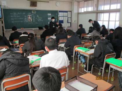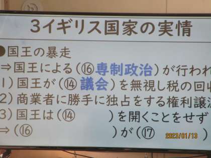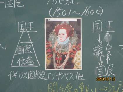 イギリスで革命が起こった背景について勉強していました。エリザベス1世の肖像画が真ん中に貼られ、テレビにはしっかりと内容がまとめらたものが映っていました。「授業の設計図」がしっかりと感じられる授業です。