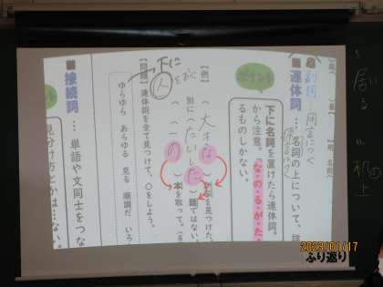 今日は連体詞、副詞、接続詞、感動詞などを大きく理解する授業でした。この授業も先生の問いかけに「あ、間違えました。」「え、なんでですか。」と応答があり、先生がそれを拾って解説するという場面が多くありました。ケースにもよるのですが、何の反応もないよりよほど、理解が深まります。すばらしい。