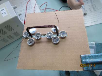 3枚めは小さな磁石がいくつも乗っている写真です。電流の流れを変えることでこの磁石がどう変化するかを見ていく実験です。
