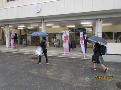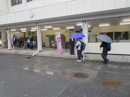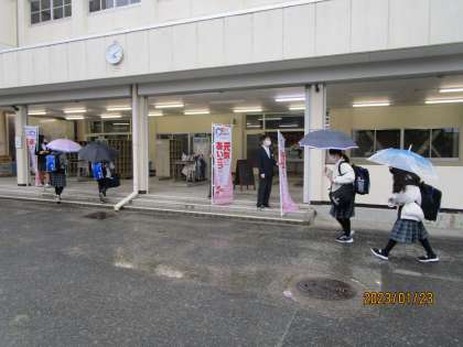 おはようございます。厳寒期の雨の朝ですが、今日もあいさつ運動ありがとう。すばらしい。