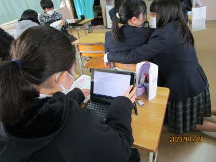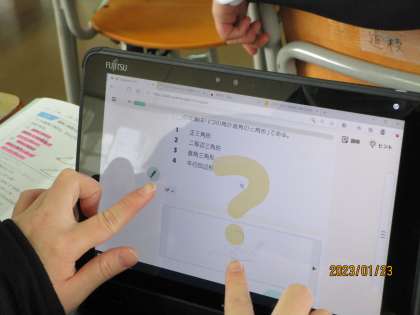 これはキュビナーをやっているところです。キュビナーとは大東市が導入しているAIドリルです。小学校1年から中学校3年までの五教科の問題をやることができます。間違うと少し優しい問題をAIが出してくれます。非常にすぐれものです。まちがうと?が出たりします。