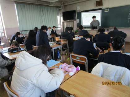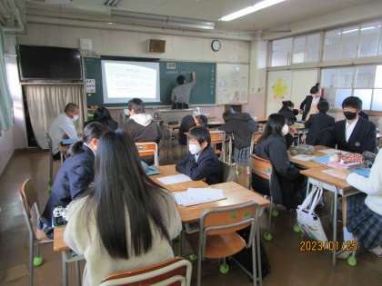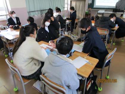 クラスが一つになって勉強していました。写真は先生の説明が終わり、学習班で意見交流を始めるところです。