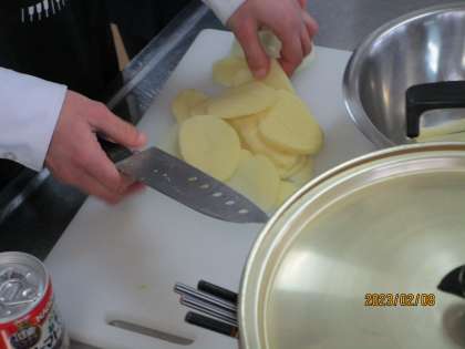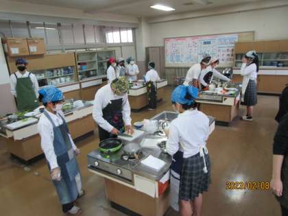 器用に包丁を使って野菜を切っていました。先生に聞くと、出来上がりもとてもおいしかったそうです。すばらしい。この調理実習は1年生が1学期に「調理実習をぜひともやりたい。コロナ感染対策はしっかり守るからお願いします。やらせてください。」とクラスで話し合い、プレゼン資料まで作り、先生たちにプレゼンし、ようやく実現したものです。1学期にはコロナの制限もまだまだ厳しい状況でした。