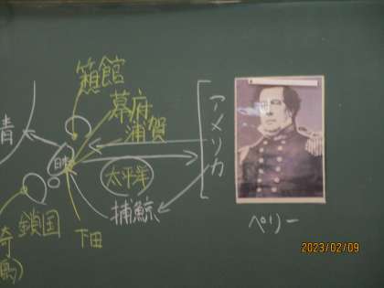 江戸時代末期の黒船来航のあたりの歴史について勉強していました。この授業では歴史上の登場人物を写真にして板書にも工夫してあります。より、興味深く授業参加できます。すばらしい。