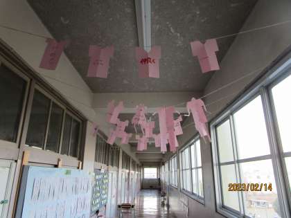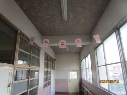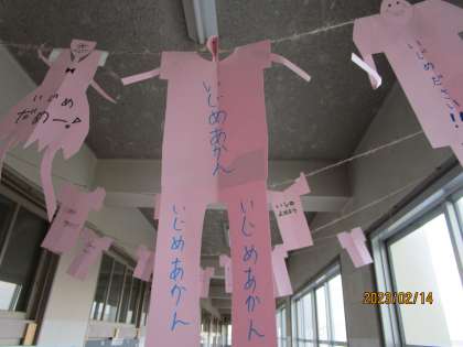 3階廊下に掲示されました。2年生が作ったピンクシャツの形のポスターです。そのポスターにはそれぞれの人の思いが書かれていました。3枚めはこの運動の仕掛け人の生活委員会が使っている教室の横の廊下に掲示されたピンクシャツポスターです。