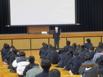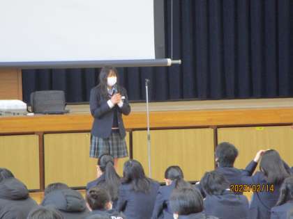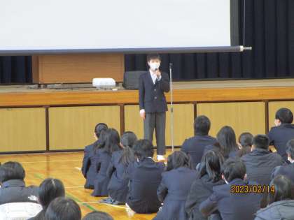 1,2枚めは「いいね運動」について話がありました。タブレット上で友人やクラスを思う行動、言葉に「いいね」を贈ろうという運動です。リクエストがあったそうです。3枚めは、生徒会会長より今日の集会の感想を述べました。ポイントを絞って、説明していました。すばらしい。