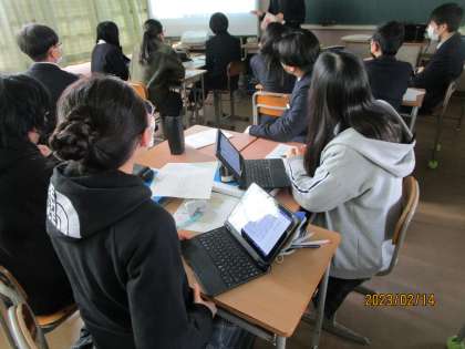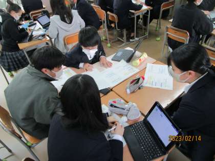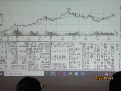「自分が応援したい会社」について説明できるようになろうという授業です。3枚めは株価を表すグラフです。この会社の株を買うのが良いのかどうか…。ものすごく現実社会に即したことを勉強していました。そして、グループで相談してどこを応援するか考えていました。