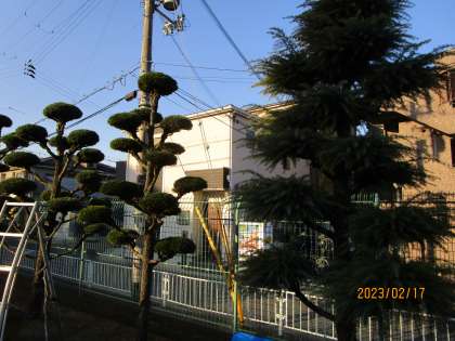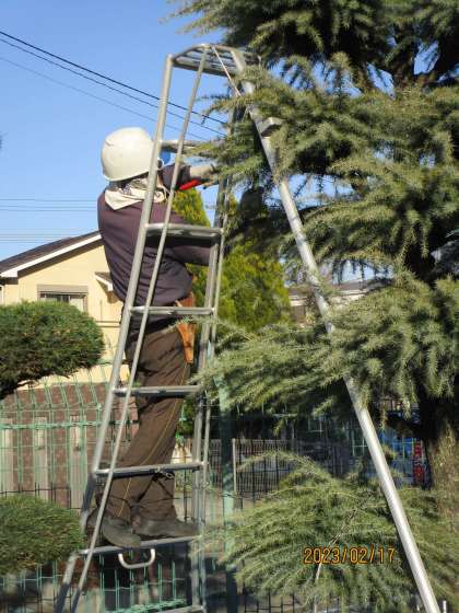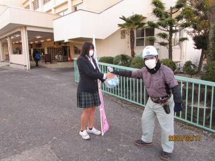 1枚め、剪定が終わった木とまだの木の差が分かりますか。すごくきれいになりました。ありがとうございます。3枚めは、作業に来ていただいている方が「これ、集めてるやろ。」と生徒会長に渡している場面です。エコキャップです。ワクチンに交換できます。ありがとうございます。