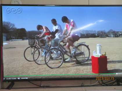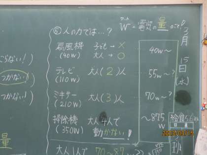 おもしろい話をしていました。化石燃料や自然エネルギーの勉強をしているのですが、今日の話は、扇風機を回す電気は40w必要だそうです。スポーツをやっているような大人で70wくらいの電力を、自転車などを使って作れるそうです。3人のスポーツマンが全力で自転車をこいで、ミキサーを回しています。電子レンジの電力を人力で出そうと思えば、筋肉もりもりの人の力が10人以上必要だそうです。乾燥機などもたくさんの電力が必要でしょうね。