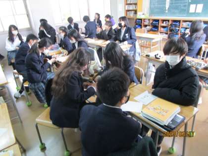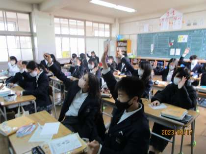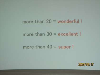 3枚めの写真は、40単語以上使って要約できた生徒が挙手しているところです。40単語以上はsuperクラスだそうです。すばらしい。