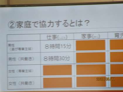 家庭での夫婦それぞれの働き方等について考えてみる時間でした。
