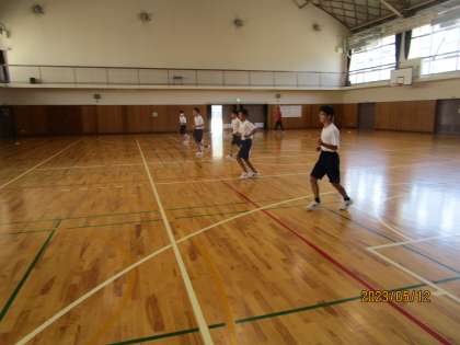 体力測定の一つ、シャトルランをしています。一定の時間で決まった距離を何往復できるか測定します。